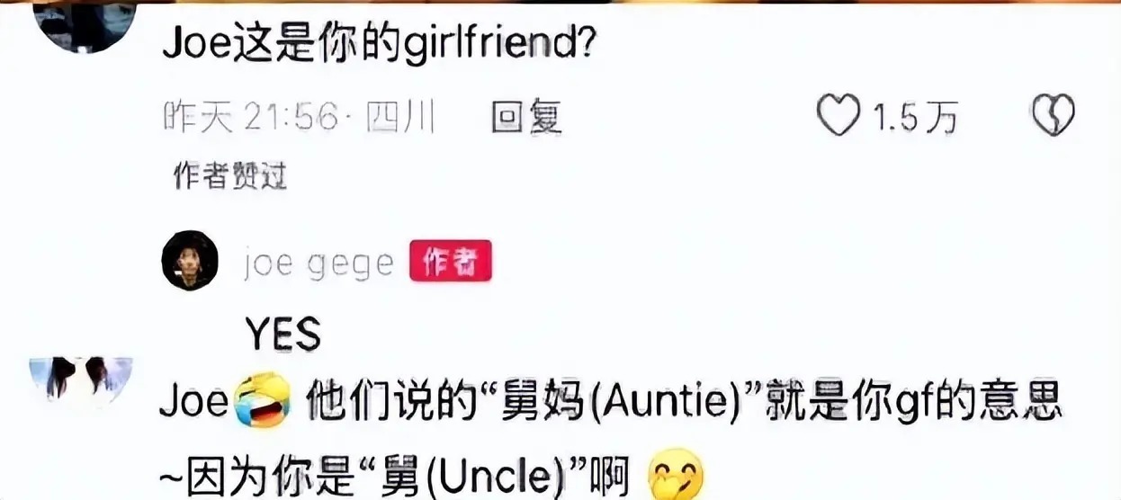 原来,在几天前joe发布了一张自己和妹妹,以及另一位女生的合照。网友在留言区询问,女方是不是“舅妈”,因为大家习惯喊“joe”为舅,所以会幽默地称joe女友是舅妈。而joe因为没有理解网友意思,则点赞承认和那位女生男女友关系。