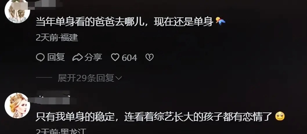 也有网友调侃自己,当年看爸爸去哪儿自己是单身,如今萌娃们都恋爱了,自己还是单身。